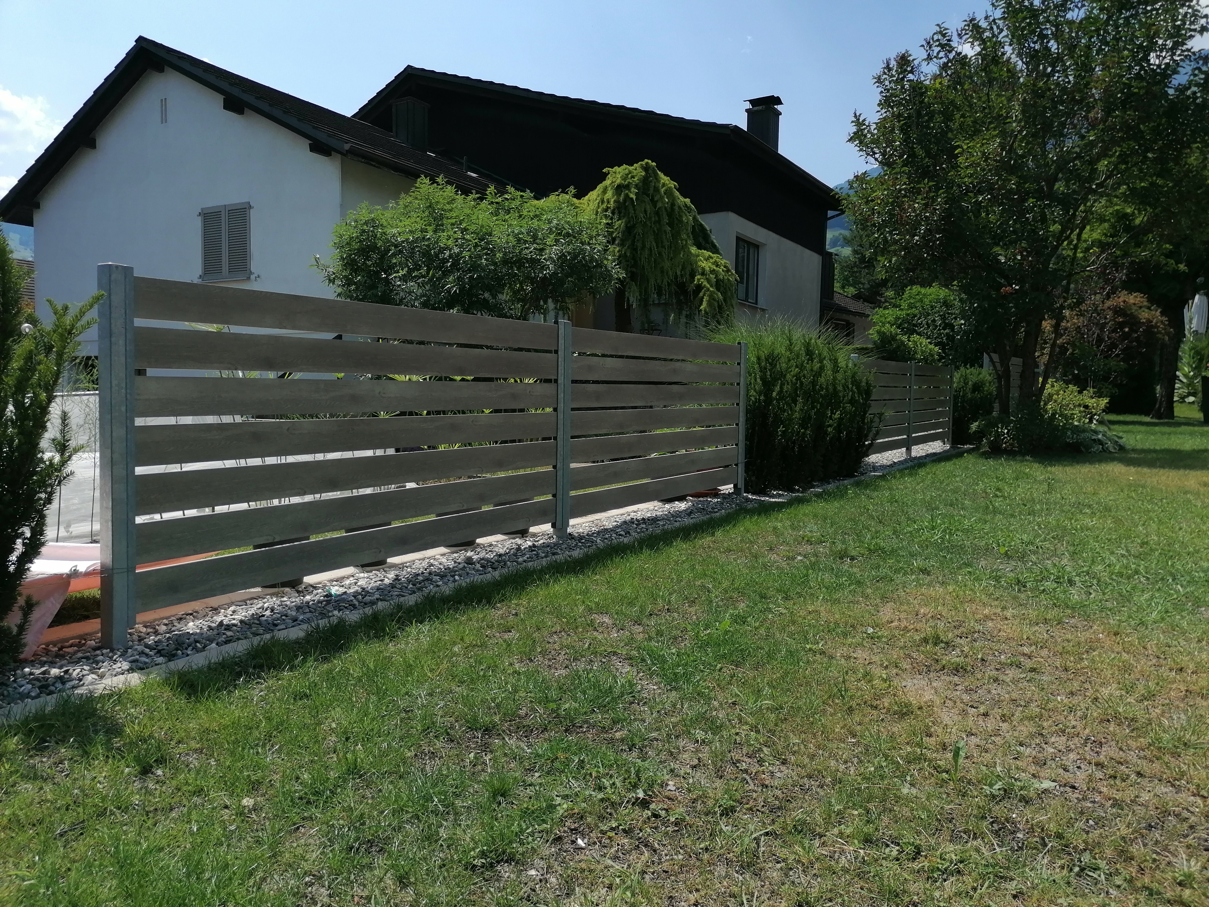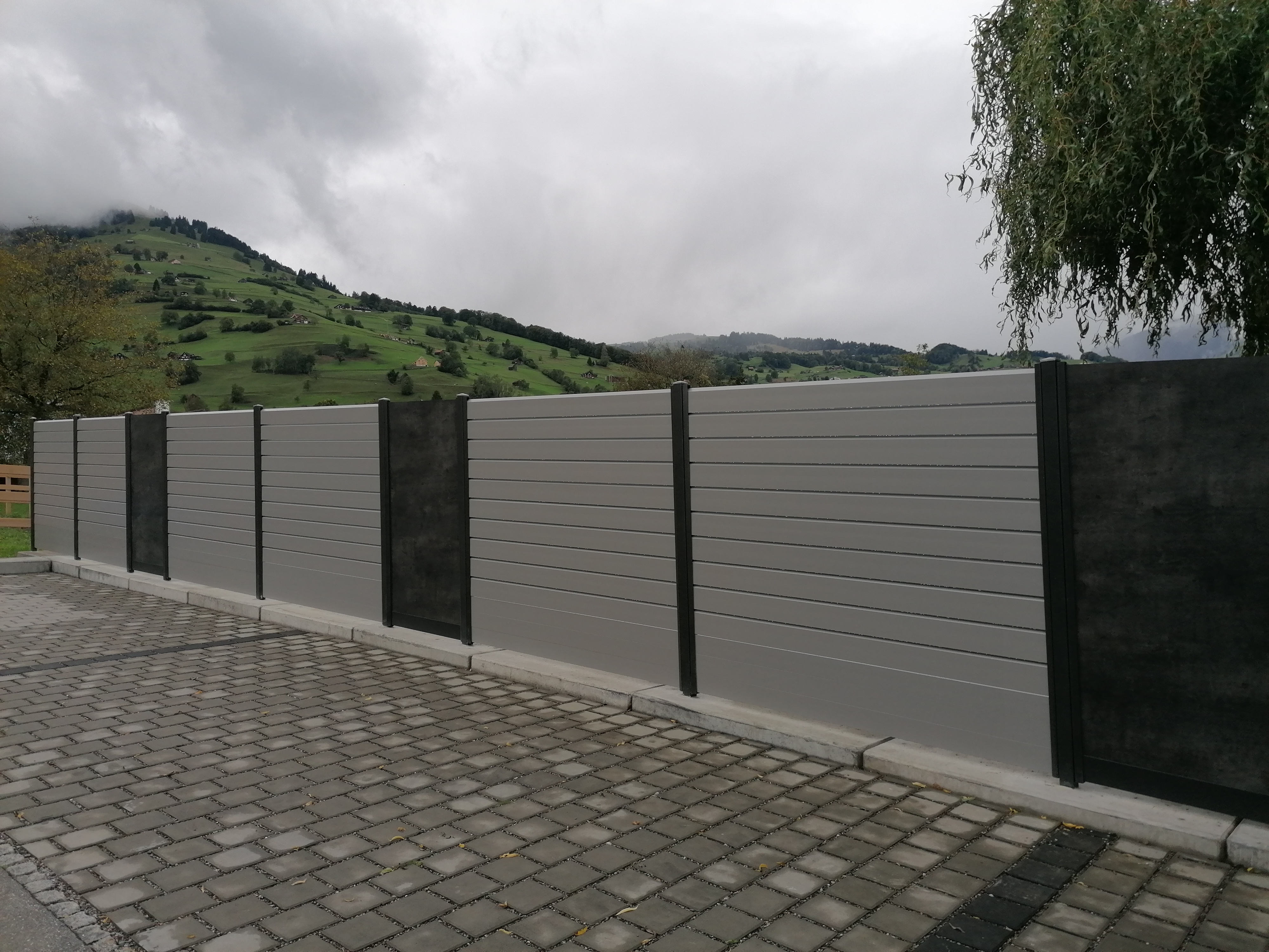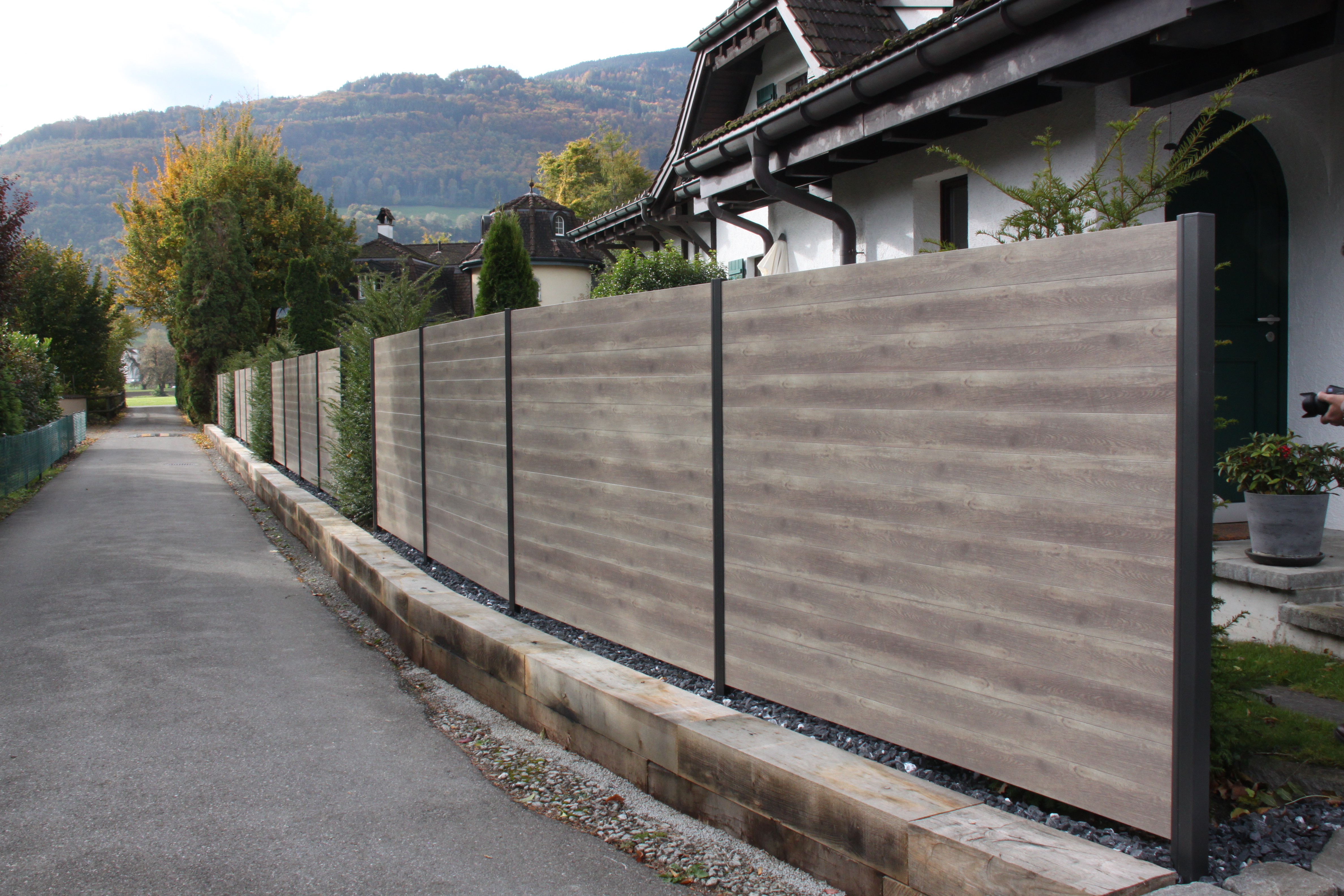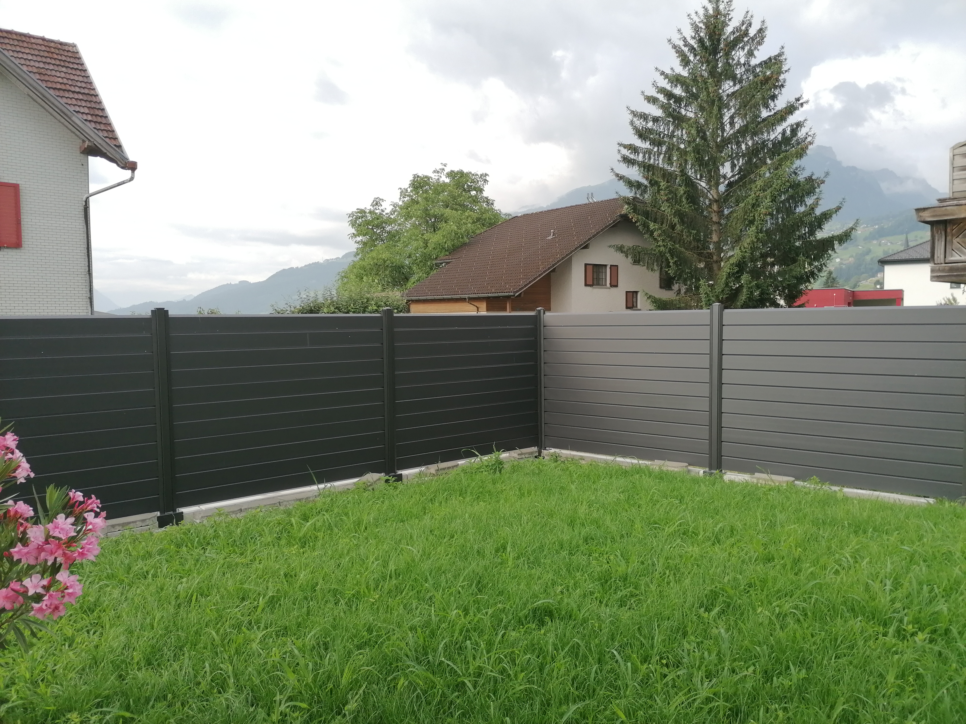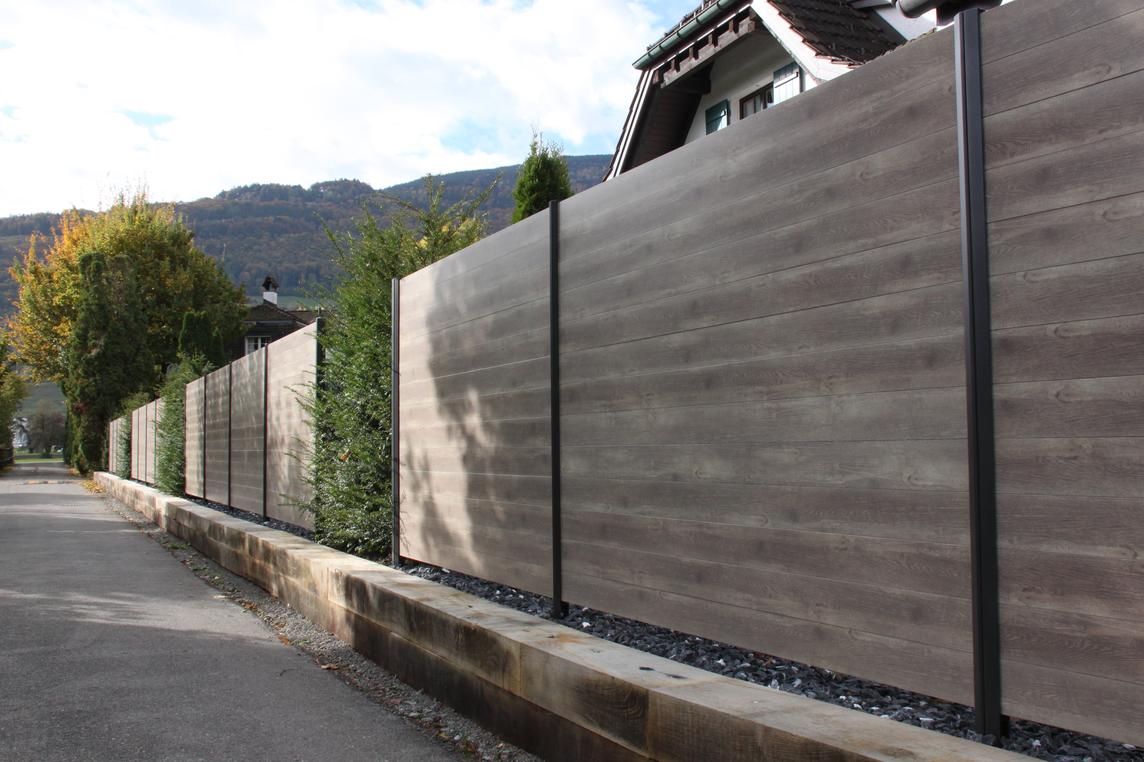 Alu ist die beste Wahl im Aussenbereich. Pulverbeschichtung mit Holzstruktur (Lärche, Nussbaum, Birke, Esche, Swiss Chalet) als Hingucker. Auch Uni-Farben sind nach Wahl möglich. Pfosten aus stabilem Stahl, feuerverzinkt plus, wenn gewünscht, pulverbeschichtet. Mit dem gleichen Grundmaterial können auch Balkongeländer gebaut werden. Fragen Sie uns nach Ideen, wir haben auch für Sie die passende Lösung. Der unten stehende Link führt Sie direkt zu unserem Lieferanten.