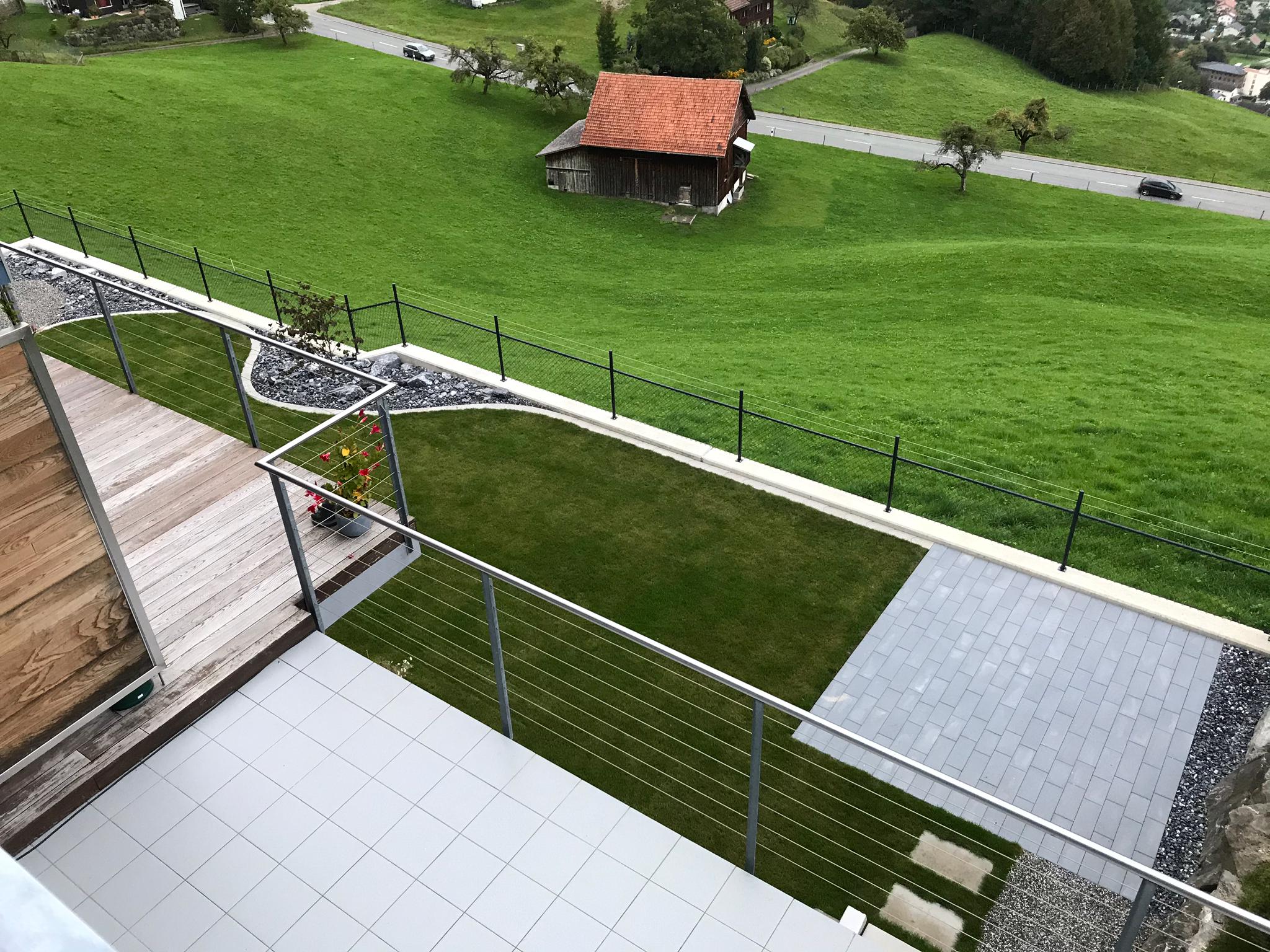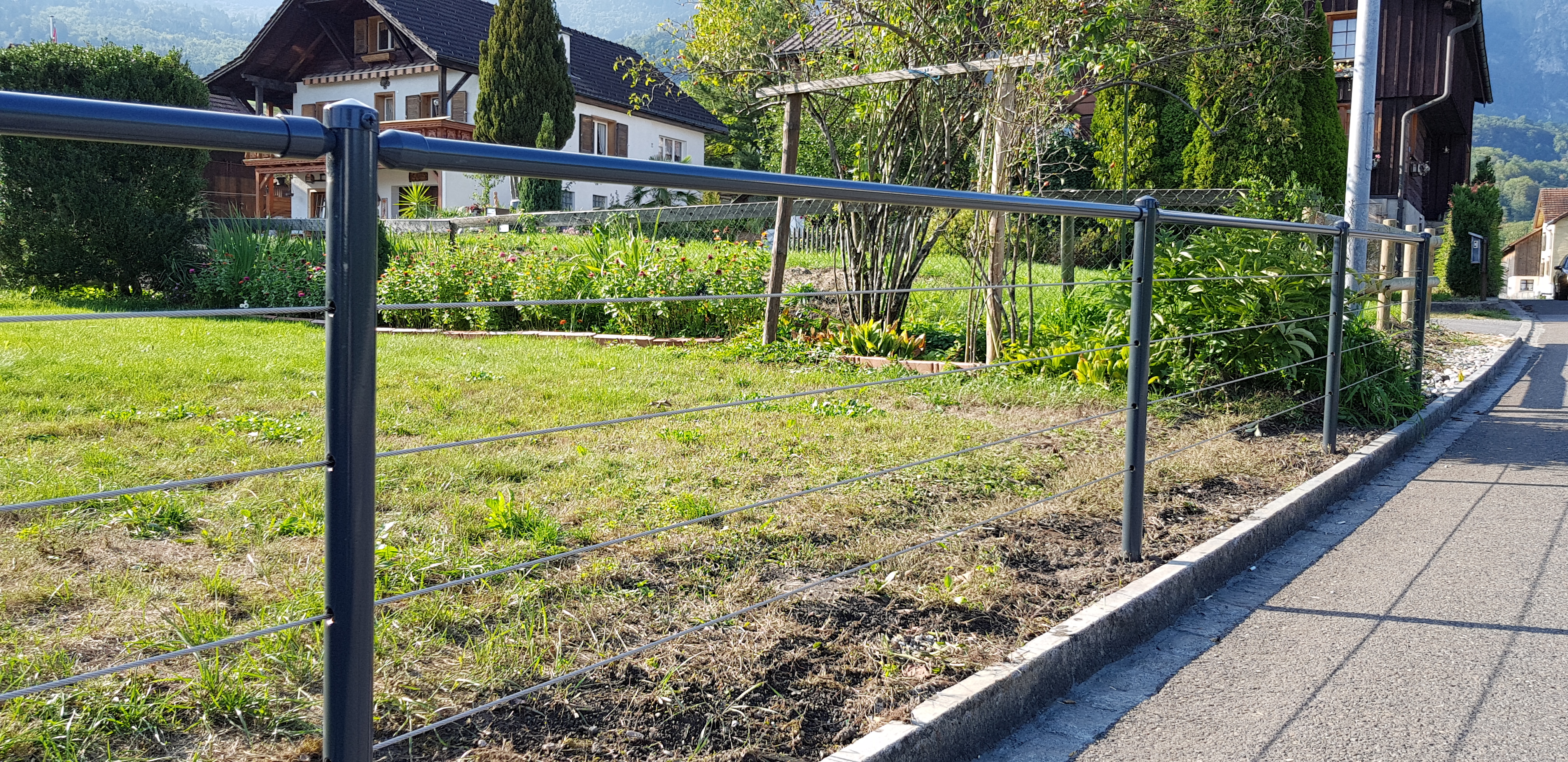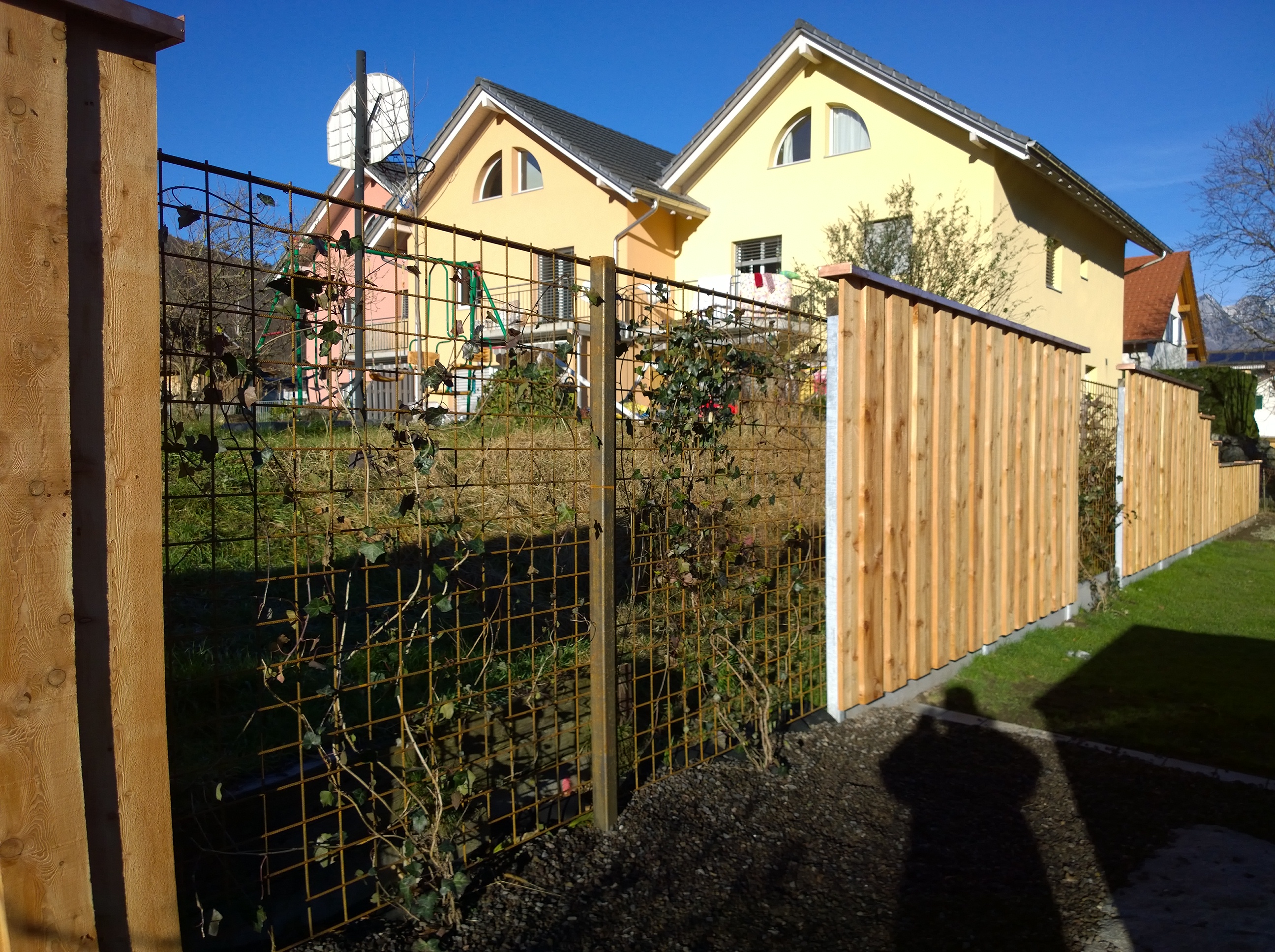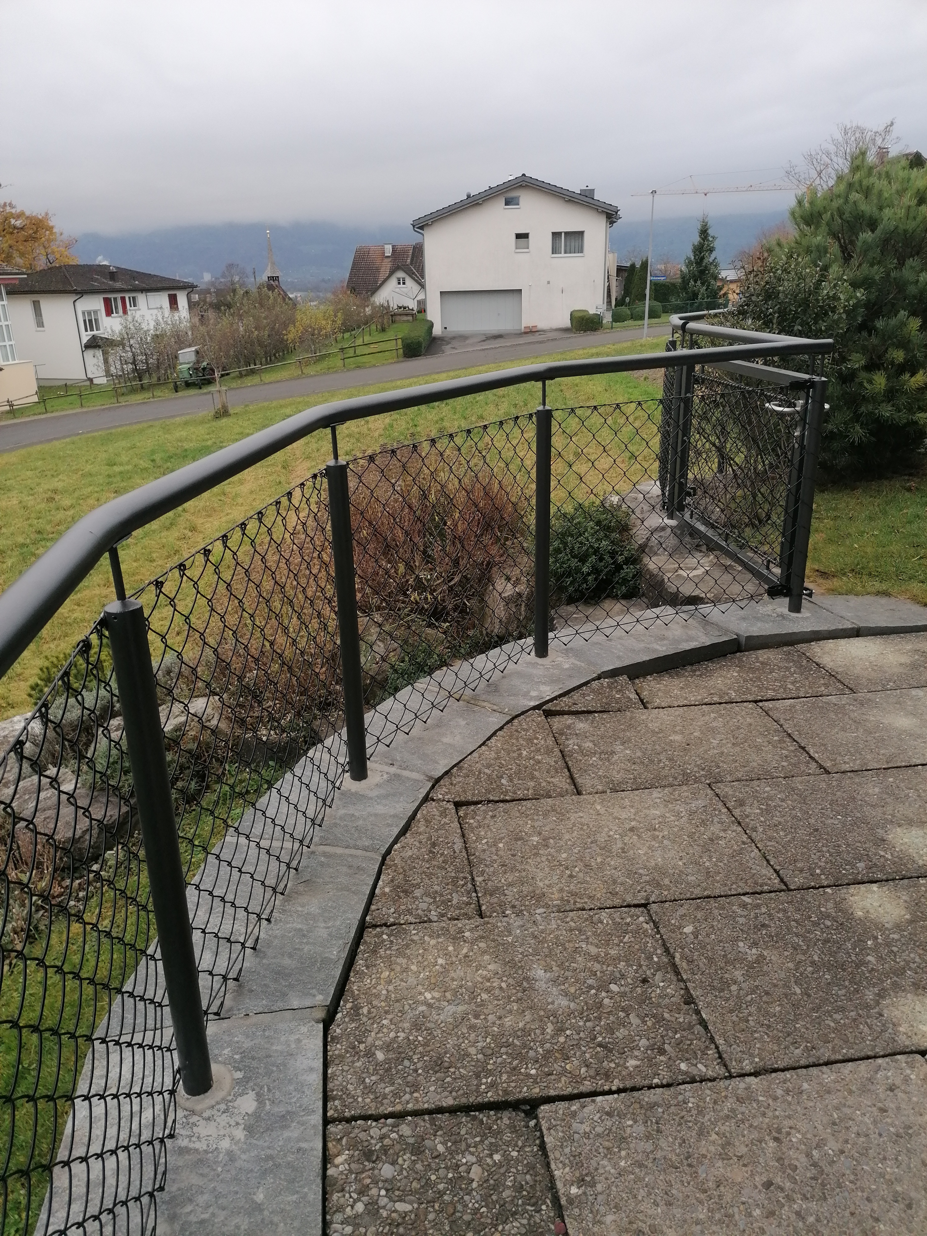 Geflechtzaun mit Handlauf als Geländer genutzt